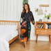 Kliv in i en värld av sofistikerad skönhet med denna svarta sidenkimono-morgonrock, prydd med livfulla blom- och naturinspirerade tryck. Det djupsvarta sidenet ger en slående kontrast till de delikata rosa och blå blommorna, medan den böljande silhuetten och de vida kimonoärmarna ger ett inslag av raffinerad elegans. Med ett knytbart skärp för justerbar passform är denna morgonrock designad för komfort och elegans, vilket gör den idealisk för avkoppling, speciella tillfällen eller som ett lyxigt lager-på-lager-plagg. Förhöj din avkopplingsrutin med detta utsökta sidenmästerverk.
