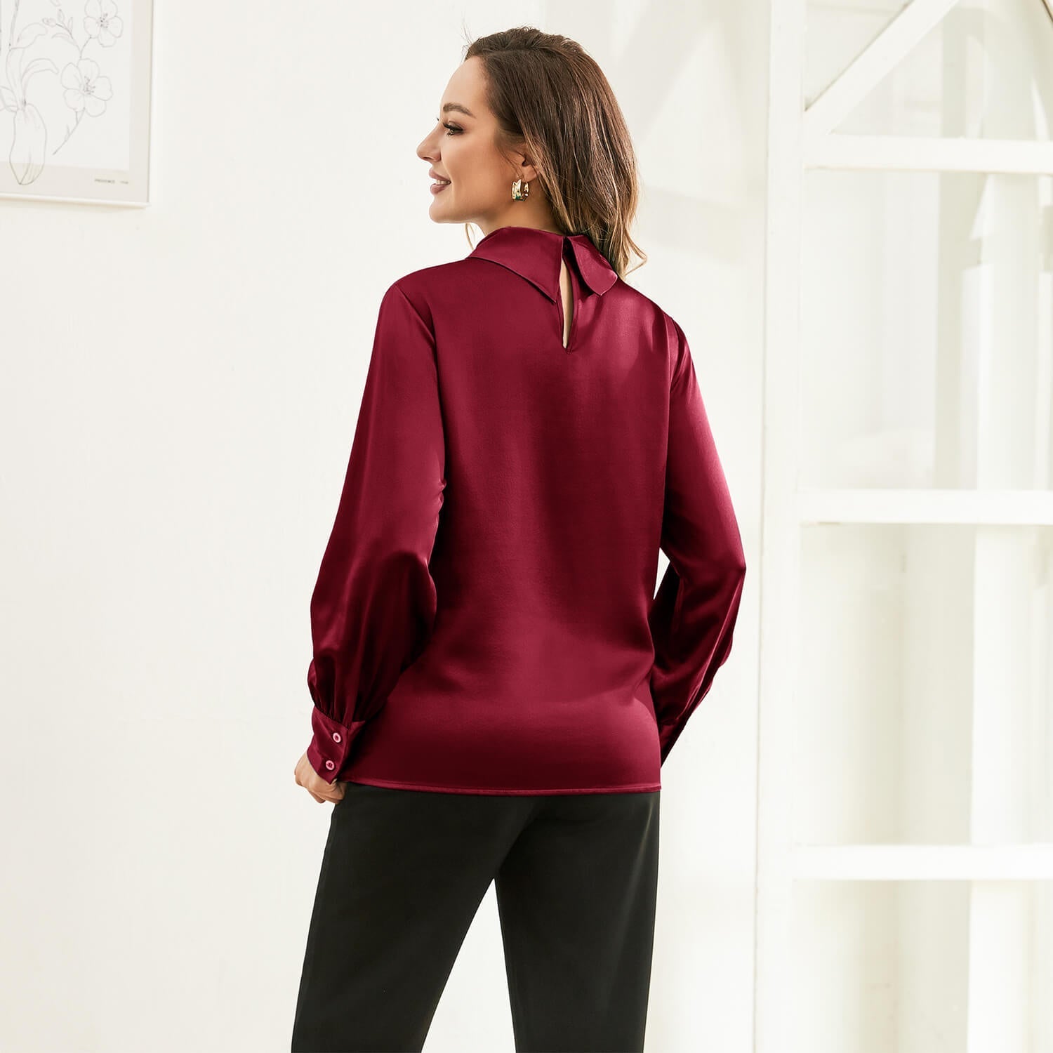 Utstråla raffinerad elegans med denna Sidenblus med hög halsringning, en perfekt blandning av lyx och sofistikering. Tillverkad av 100 % siden, har denna blus en elegant hög halsringning som förstärker dess eleganta estetik. De långa ärmarna med rynkade manschetter skapar en graciös, böljande silhuett, vilket gör den till ett idealiskt val för både arbetskläder och festkläder.