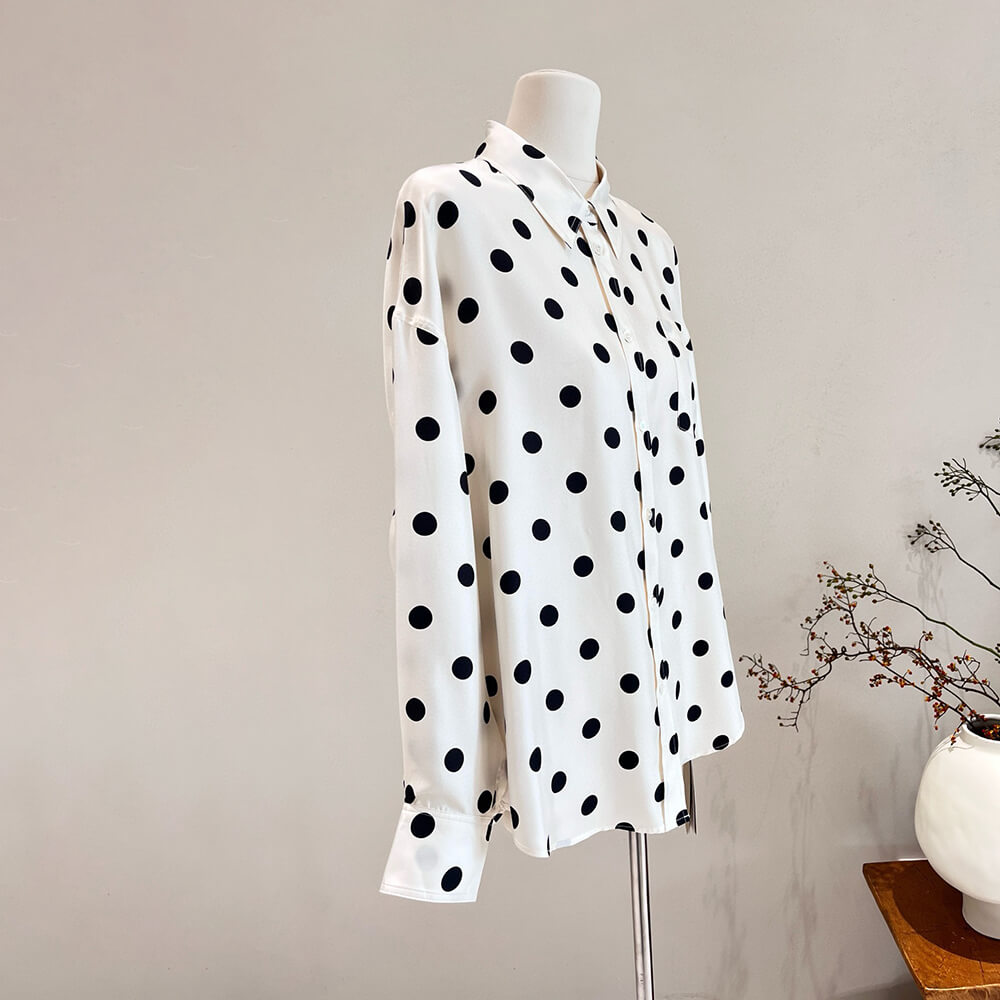 Förhöj din vardagsgarderob med denna lyxiga sidenskjorta för kvinnor, med en tidlös vit bas med djärva svarta prickar. Tillverkad av 100 % siden, erbjuder den en slät, mjuk textur och naturlig lyster som ger elegans till vilken outfit som helst. Designen inkluderar en klassisk krage, bröstficka och knäppning framtill, med långa ärmar som du kan rulla upp för en mer avslappnad känsla. Lätt, andningsbar och elegant, perfekt för arbetsdagar, helgbruncher eller eleganta caféstunder.