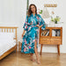 Denna eleganta sidenmorgonrock visar upp en fantastisk kombination av konstnärlighet och lyx. Tillverkad av slät, lätt siden, faller den vackert över kroppen och ger en mjuk och andningsbar känsla. Det intrikata blom- och påfågeltrycket ger en exotisk och sofistikerad touch, vilket skapar en tidlös och graciös estetik. Designad med vida kimonoärmar, ett knytbart sidenbälte och en böljande lång silhuett med en subtil sidosprund, förstärker denna morgonrock både komfort och lockelse.